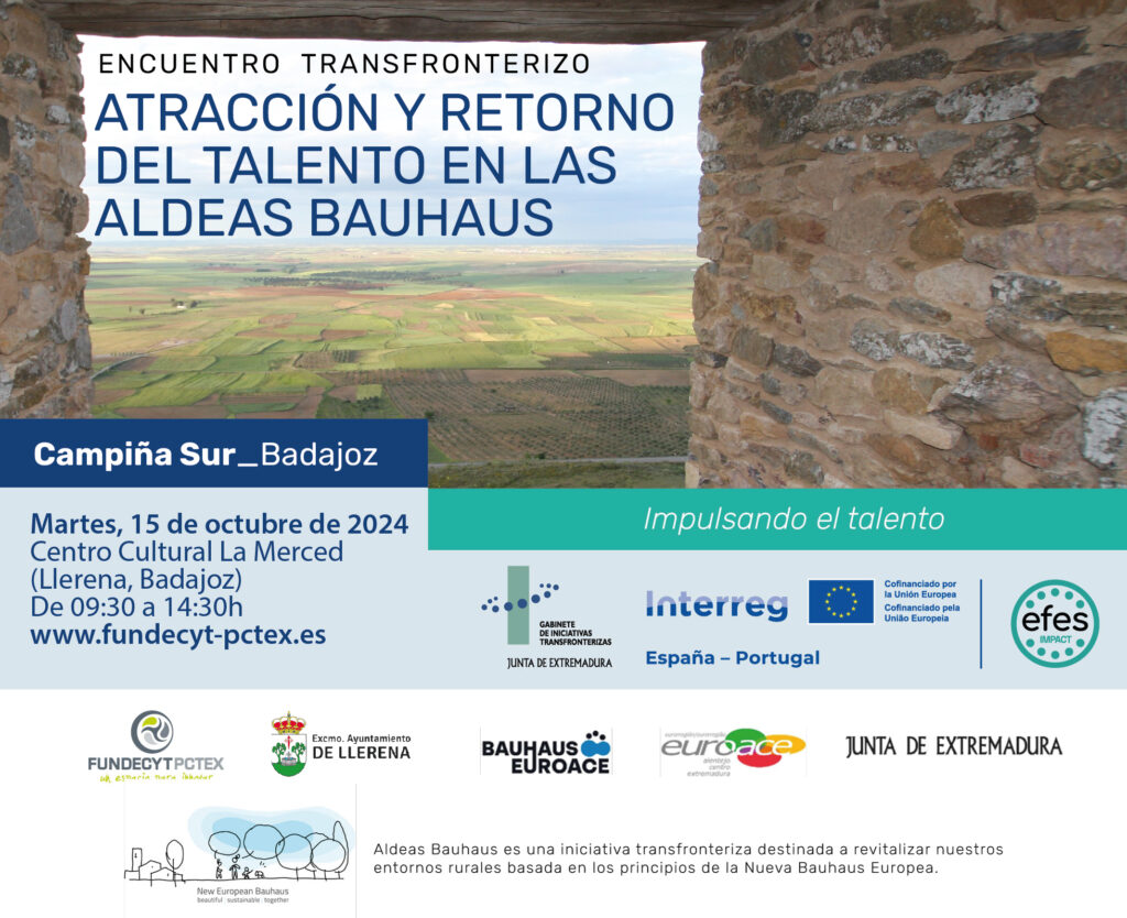 Desde FUNDECYT-PCTEX, en colaboración con la Dirección General de Acción Exterior de la Junta de Extremadura -a través del Gabinete de Iniciativas Transfronterizas- te invitamos a participar en el Encuentro Transfronterizo ALDEAS BAUHAUS Impulsando el talento. Esta actividad conjunta, está enmarcado en el proyecto EFES Impact y el Proyecto GIT EUROACE TERRITORIO CON VIDA, cofinanciados por la Unión Europea a través del Programa de cooperacion Interreg España-Portugal (POCTEP) 2021-2027.